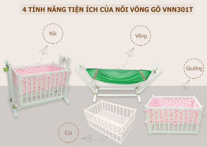– Bộ phụ kiện đi kèm gồm có vây, nệm, mùng, lưới võng. Nôi có 3 màu: nôi có màu tự nhiên và màu cánh dán, nôi có màu trắng