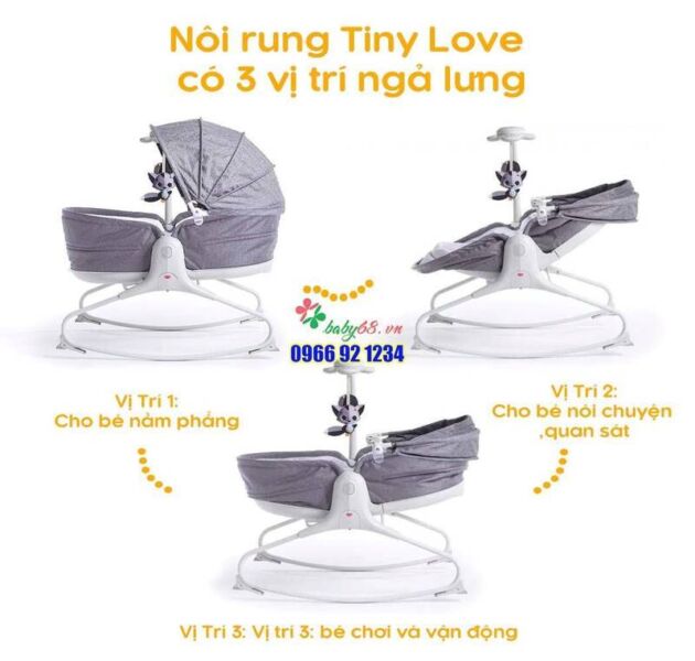 Nôi rung Tiny Love có 3 vị trí ngả lưng, mẹ có thể dễ dàng điều chỉnh sao cho phù hợp với từng giai đoạn lớn của bé, có thể hiểu vị trí 1: cho bé nằm phẳng, vị trí 2: cho bé nói chuyện, quan sát, vị trí 3: bé chơi và vận động