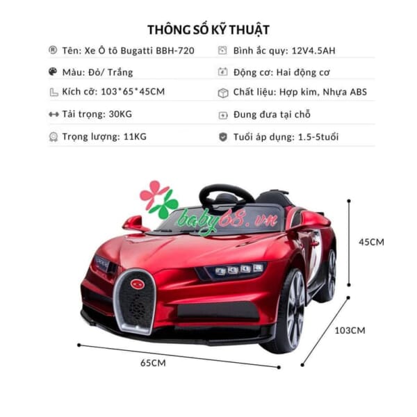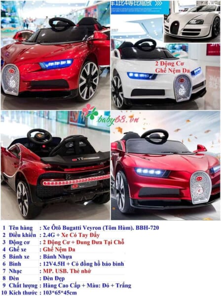 Ô tô điện trẻ em Bugatti Veyron (Tôm Hùm) BBH-720 được thiết kế kiểu dáng thể thao dòng siêu xe với gầm thấp, dáng vô cùng thanh lịch và sang trọng, xe được trang bị 2 động cơ khoẻ khoắn tăng tốc nhanh của dòng siêu xe. Xe được mô phỏng như một chiếc ô tô thật có chế độ bé tự lái hoặc chế độ điều khiển cho Bố Mẹ, xe được trang bị hệ thống âm thanh, đèn led vô cùng tân tiến giúp bé thích thú hơn khi lái xe