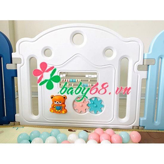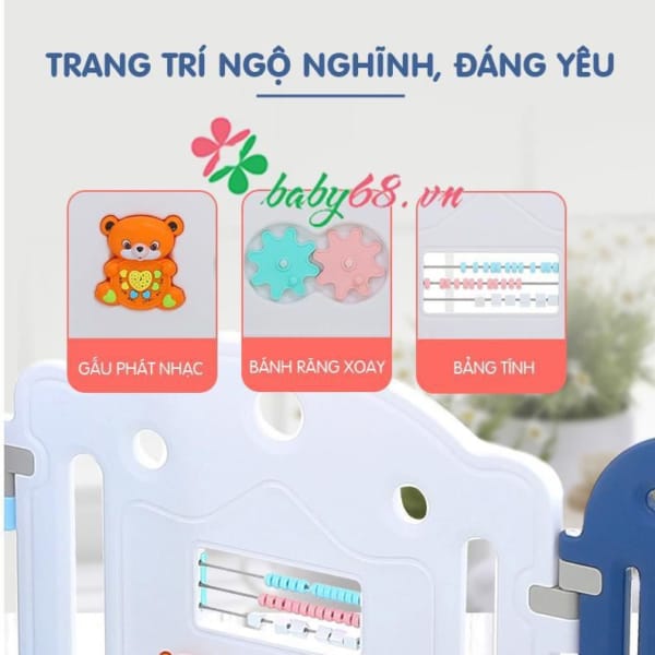 – Quanh quây được gắn các món đồ chơi, máy phát âm thanh, bảng ghép chữ cái, các trò chơi tập đếm vô cùng thú vị.