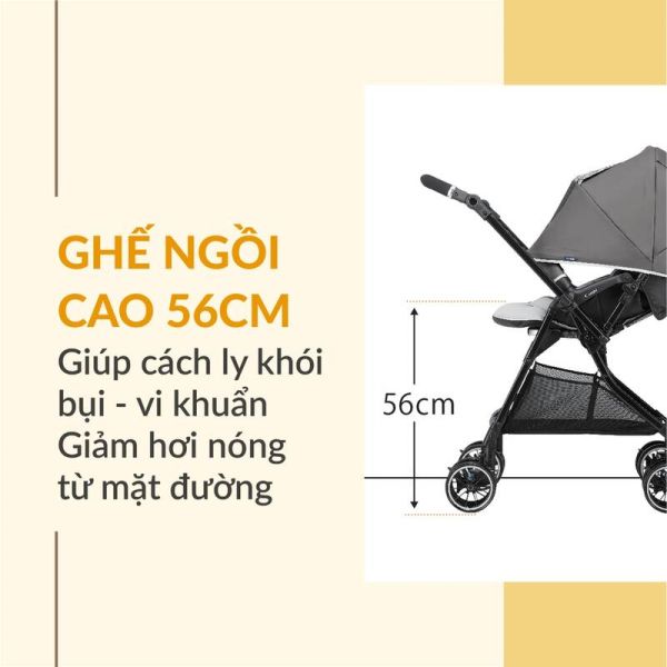 Ghế ngồi cao 56cm giúp cách ly vi khuẩn – khói bụi – giảm hơi nóng từ mặt đường. Đồng thời với chiều cao này, tương tác giữa mẹ và bé sẽ tốt hơn (Bé nhìn thấy mẹ ở khoảng cách gần hơn, mẹ dễ dàng hơn khi bế bé ra vào xe đẩy).