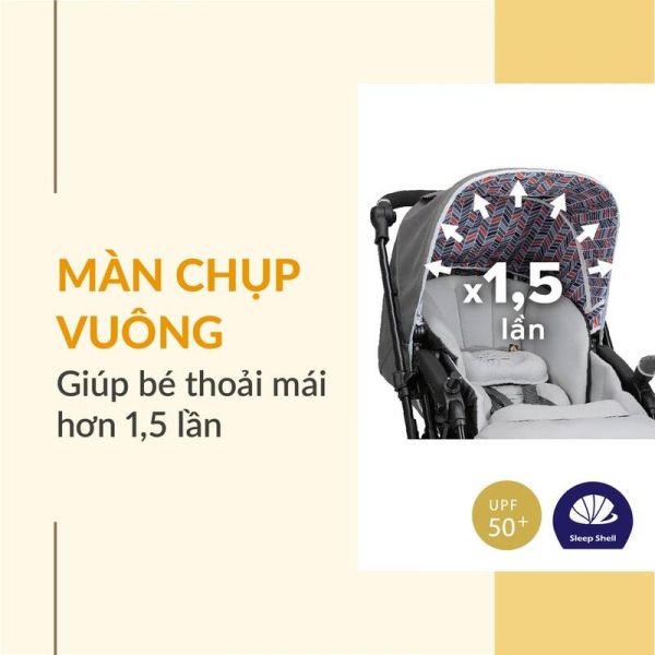 Với kiểu dáng màn chụp vuông họa tiết hoa văn, Sugocal Compact góp phần tạo nên phong cách thời trang cá tính cho mẹ trong những chuyến đi. Bên cạnh đó, màn chụp vuông tăng không gian phía trong tới 1,5 lần (so với màn chụp tròn truyền thống) giúp bé hô hấp dễ chịu, thoải mái hơn ngay cả khi hạ màn chụp.