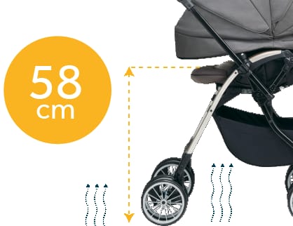 5. Ghế ngồi cao 58cm – cao nhất trên thị trường giúp cách ly khói bụi – giảm hơi nóng từ mặt đường. Đồng thời với chiều cao này, tương tác giữa mẹ và bé sẽ tốt hơn (Bé nhìn thấy mẹ ở khoảng cách gần hơn, mẹ dễ dàng hơn khi bế bé ra vào xe đẩy)