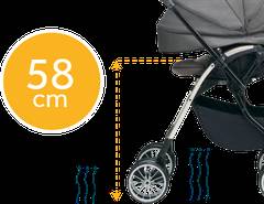 5. Ghế ngồi cao 58cm – cao nhất trên thị trường giúp cách ly khói bụi – giảm hơi nóng từ mặt đường. Đồng thời với chiều cao này, tương tác giữa mẹ và bé sẽ tốt hơn (Bé nhìn thấy mẹ ở khoảng cách gần hơn, mẹ dễ dàng hơn khi bế bé ra vào xe đẩy).