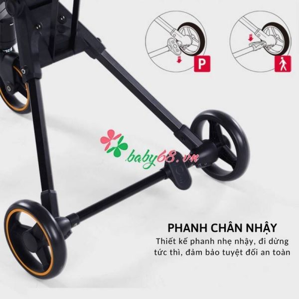– Hệ thống phanh chân của xe được bố trí ở phía sau có tác dụng cố định xe và tránh bị trượt khi đặt xe ở những đoạn đường dốc. Và chỉ cần một thao tác gạt phanh xuống phía dưới là ba mẹ đã có thể cố định được chiếc xe đẩy Playkids X6 để đảm bảo an toàn cho trẻ.