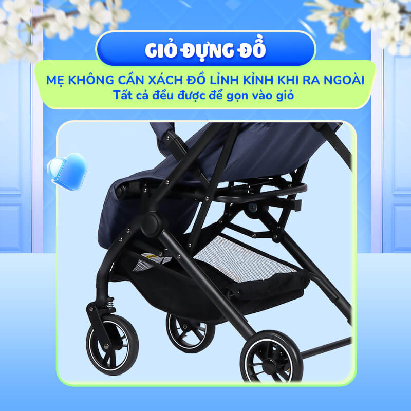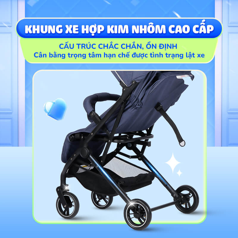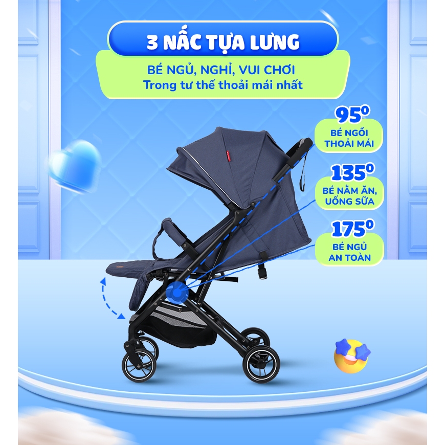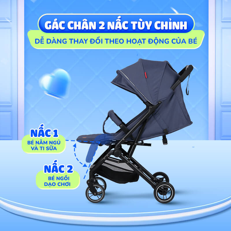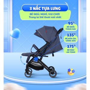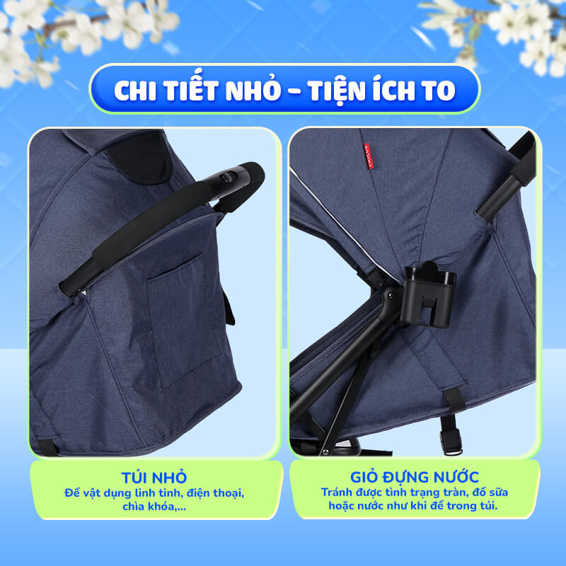 - Tiện ích: 1 chiều đẩy, gấp nhỏ gọn, 3 nấc tựa lưng, 2 nấc tựa chân, đai an toàn 5 điểm, tay vịn an toàn, mái che nhiều nấc, bánh xe giảm xóc, cửa sổ thoáng khí, lưới quan sát bé, phanh chân, giỏ đồ rộng