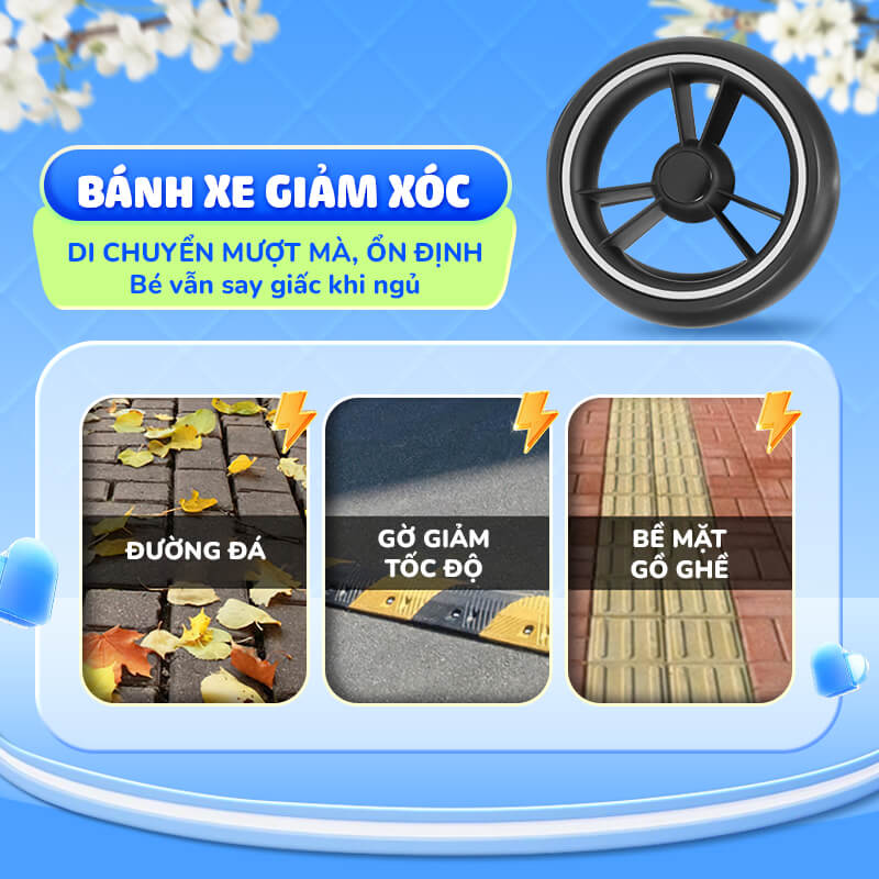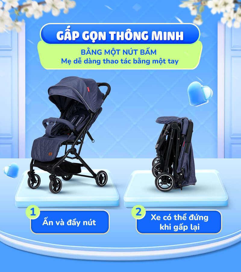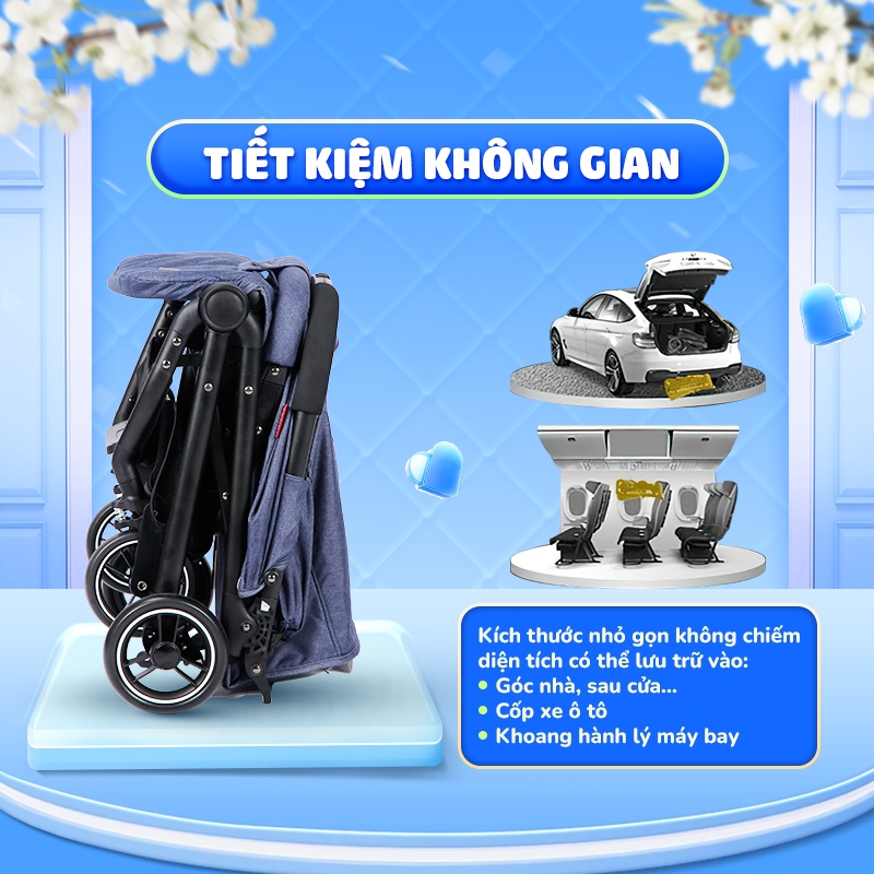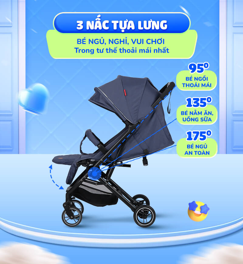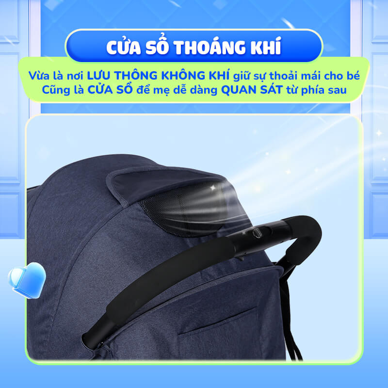 - Tiện ích: 1 chiều đẩy, gấp nhỏ gọn, 3 nấc tựa lưng, 2 nấc tựa chân, đai an toàn 5 điểm, tay vịn an toàn, mái che nhiều nấc, bánh xe giảm xóc, cửa sổ thoáng khí, lưới quan sát bé, phanh chân, giỏ đồ rộng