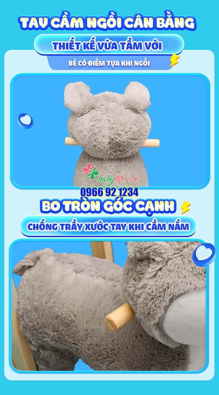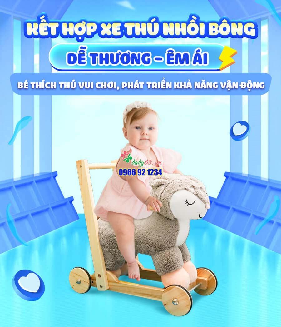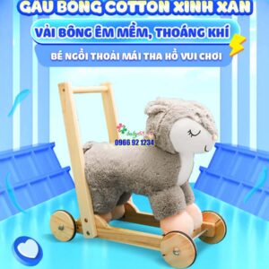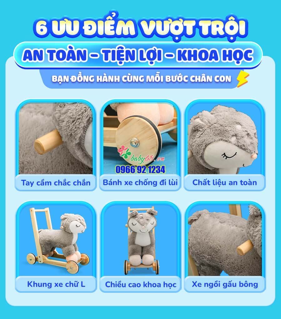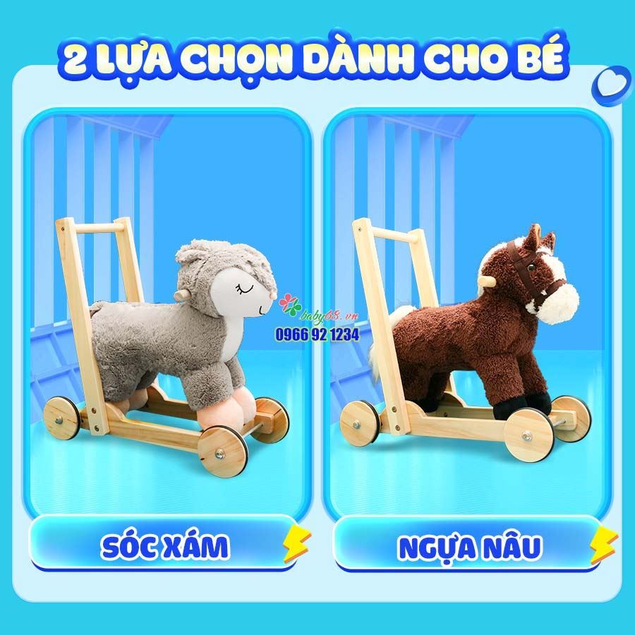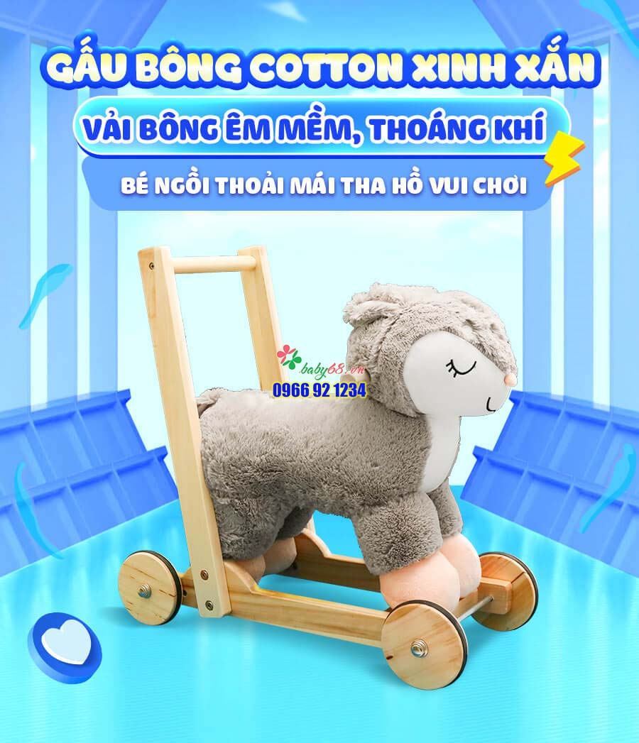 Xe đẩy tập đi thú bông ngựa sóc được làm từ chất liệu vải polyeste cao cấp êm ái, đế gỗ thông trắng , sơn sấy chống mối mọt ẩm mốc. Bánh xe chịu lực nhựa an toàn tuyệt đối cho các trẻ.