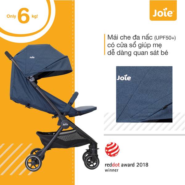 Xe đẩy Joie Pact có mái che đa nấc với UPF50+ tương đương với ngăn chặn được 98% tia UV, có cửa sổ giúp mẹ dễ dàng quan sát bé.