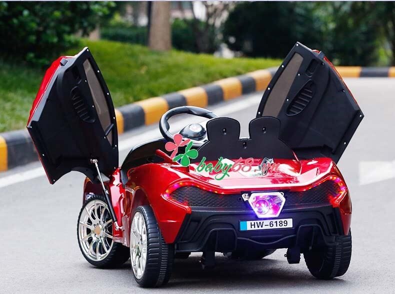 Xe ô tô điện HW 6189 được thu hút ngay ánh nhìn đầu tiên nhờ kiểu dáng thể thao mạnh mẽ. Với gam màu đỏ nổi bật, cùng với đó là hai cánh thiết kế dạng chéo đẹp mắt và mang tính độc đáo cao.