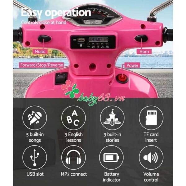 Xe máy điện cho bé Vespa 801.B là sản phẩm thu nhỏ của chiếc xe đời thật hiện nay, nó sở hữu đầy đủ đặc điểm từ kiểu dáng đến chi tiết xung quanh xe, với vẻ ngoài nhỏ nhắn đáng yêu của sản phẩm các bé có thể dễ dàng điều khiển vui chơi cùng nhũng người thân trong gia đình.