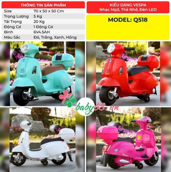 Dòng xe Vespa luôn là xe được yêu thích nhất, không chỉ đối với xe thật mà các xe điện đồ chơi cũng vậy. Mẫu Vespa Q518 với thiết kế siêu dễ thương đang làm mưa làm gió trên thị trường được sự yêu thích của các bé không chỉ ở thiết kế mà xe còn có rất nhiều màu sắc cho bé lựa chọn. Xe được thiết kế 2 bánh phụ giúp xe giữ thăng bằng hỗ trợ bé vui chơi không lo té ngã.