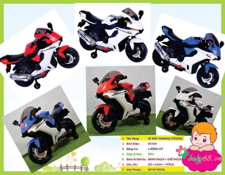 Được lấy cảm hứng từ ý tưởng thiết kế của xe thể thao Yamaha. Xe máy điện trẻ em TR 1603 thuộc dòng phân khối khỏe khoắn và kiểu dáng hầm hố như những chiếc mô tô thật của người lớn. Theo như đánh giá từ các chuyên gia, TR 1603 chính là phương tiện giúp trẻ tăng cường sức khỏe, phát triển trí não và tạo niềm vui mỗi ngày.
