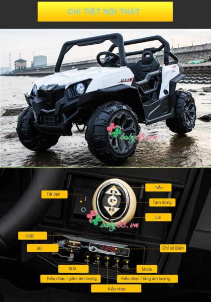 - Chức năng: Đèn, còi, nhạc, volumn, số tiến, lùi, điều khiển, cổng kết nối Bluetooth bé thoả sức nghe nhạc mình yêu thích, đài FM