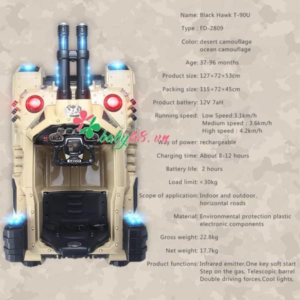 Xe tăng điện trẻ em FD-2809 này được thiết kế mô phỏng giống như một chiếc xe tăng quân sự ngoài đời thật. Giúp bé hóa thân thành những chú lính xe tăng cừ khôi trong tương lại. Đây là món quà tuyệt vời cho bé mà bố mẹ không thể bỏ qua.